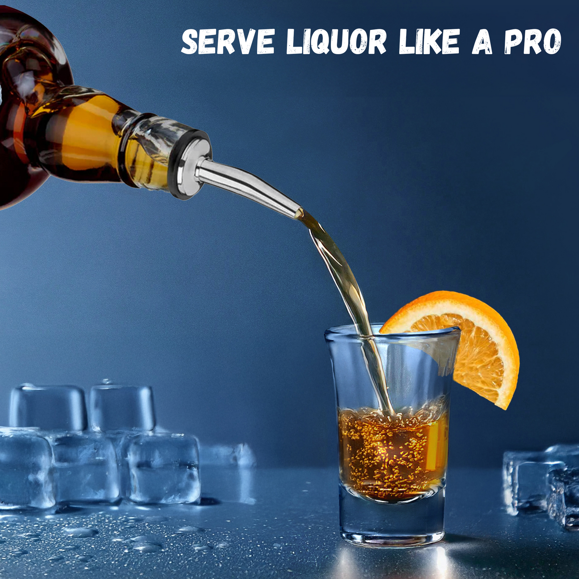 BEAUTIFUL SUPER CLEAR GLASSES that measure 1.5-ounce liquid, 4 x 4 Inches Felt coasters reversible with two-tone light gray/dark gray, Bar grade 304ss pourers that fit most bottles.