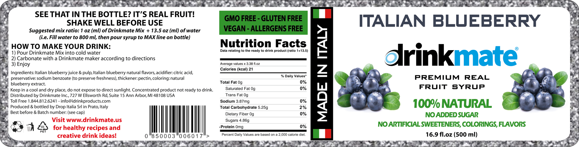 The Drinkmate Blueberry Premium Italian Syrup is manufactured in Italy with the following qualities: