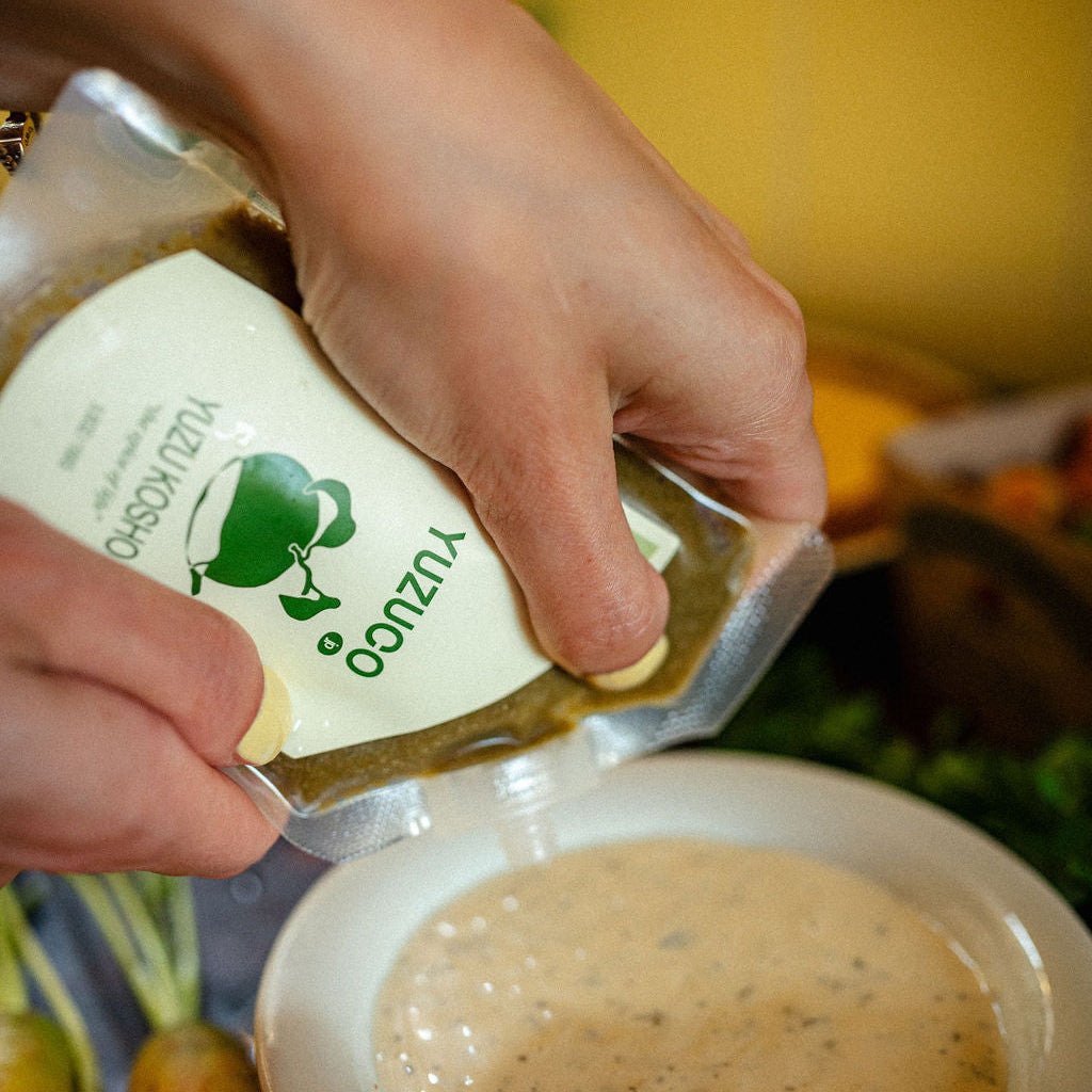 Citrus, salt, and spice - a perfect trio. Three simple ingredients that prove less is more. This bold paste is a delicious condiment on its own when dotted onto bites of fish, meat, chicken or veggies. It also performs beautifully as an addition to sauces, aiolis, soups, dressings, marinades, and everything in between. A beloved staple across Japan, Yuzu Kosho is made by combining yuzu peel, salt, and a spicy pepper into a paste. Produced in Miyazaki Prefecture, Japan. Your new pantry essential.