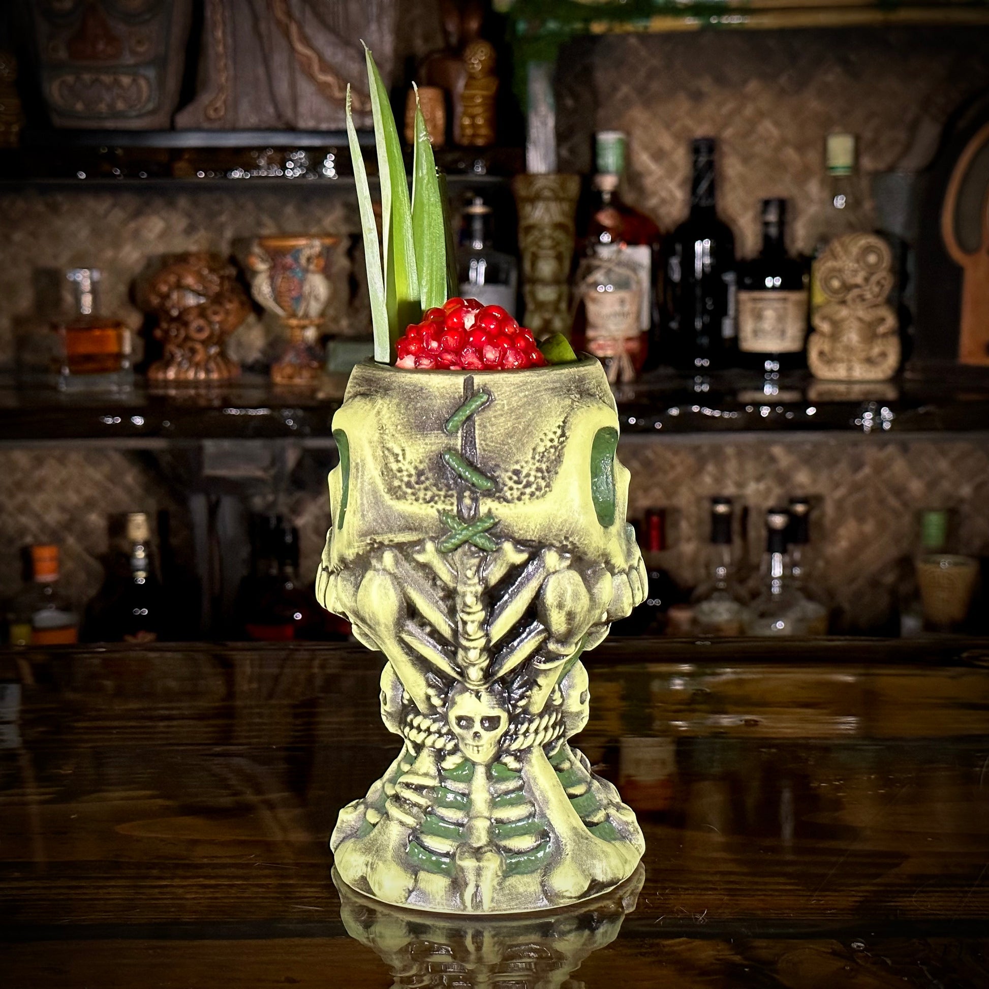 This mug's name translates to the 'Cup of Death'. Named appropriately as it's mostly built from the bones of those who have failed to escape the temple deep within the jungle. A legend persists that only those who drink from this vessel will have the fortitude to make it out alive.