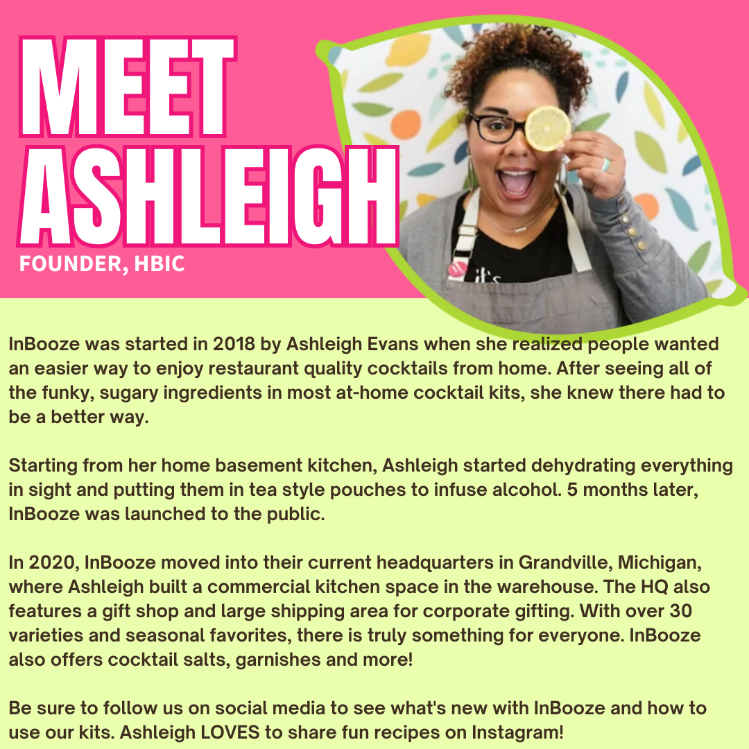 InBooze™ is owned by Ashleigh Evans, a mother of 4 and cocktail lover. In 2018, she wanted an easier (and healthier!) way for everyone to enjoy drinks at home. By infusing with simple fruits, spices and herbs, you know exactly what is in your cocktail!