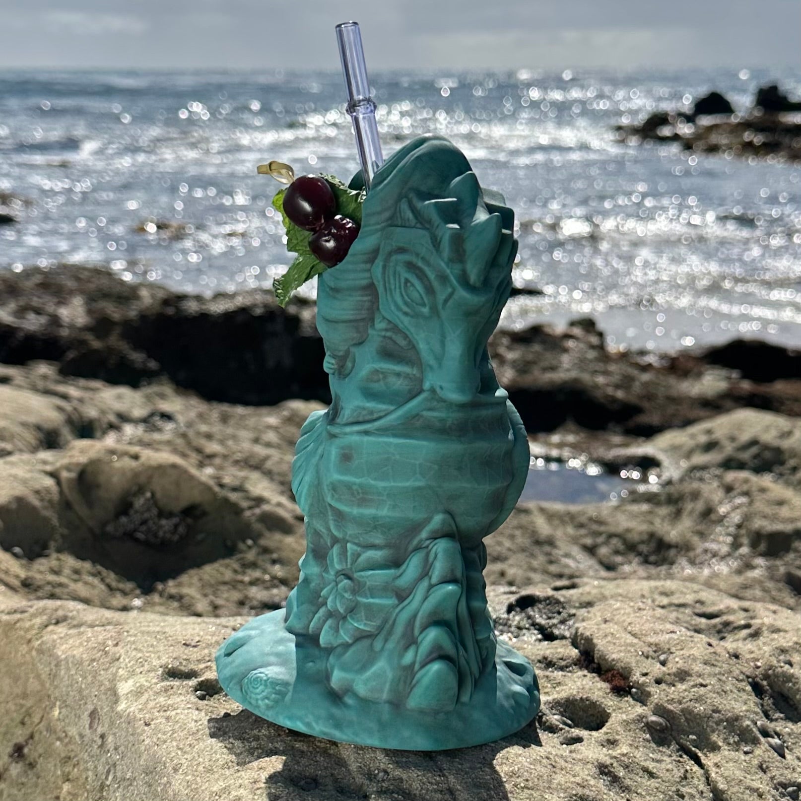 This siren and her giant seahorse roam the seas, but no one knows exactly why. For hundreds of years sailors and seafaring folk have claimed to have seen these magnificent creatures. Endless rumors persist, but the most common is that the pair lure you to the depths of a tasty libation. This ceramic tiki mug is about 8 inches tall, and holds about 19oz