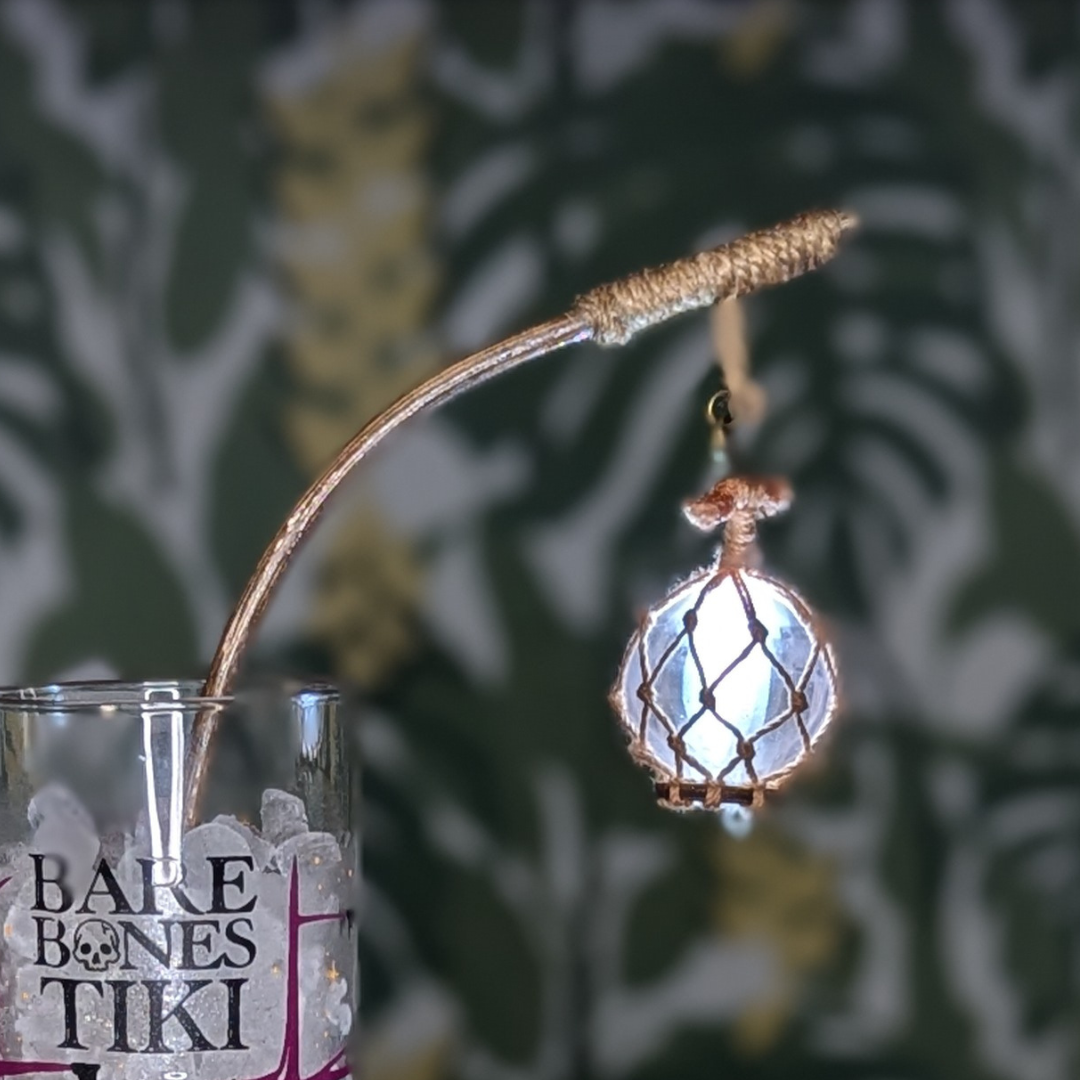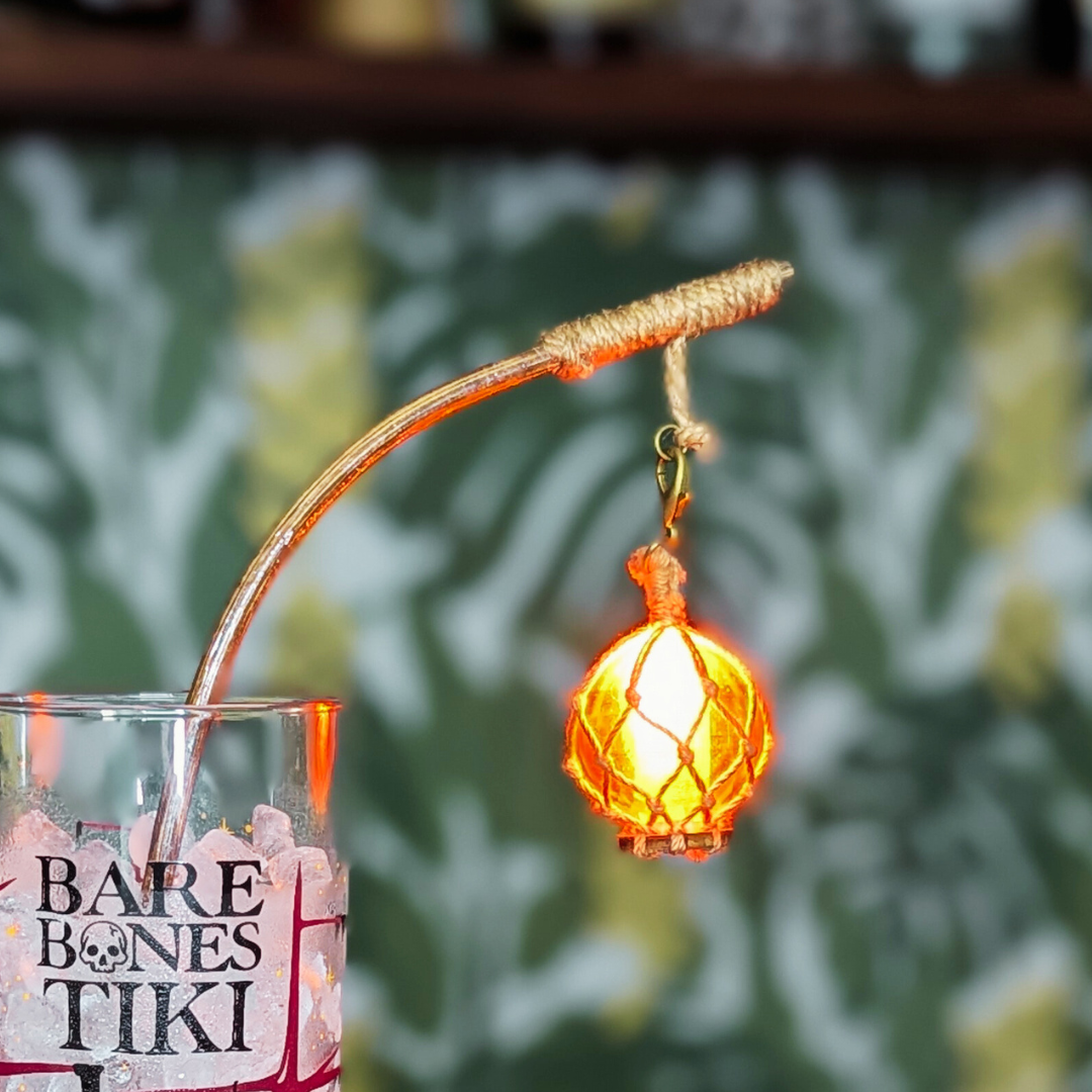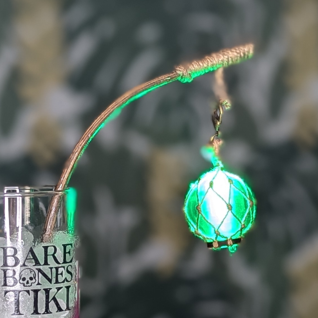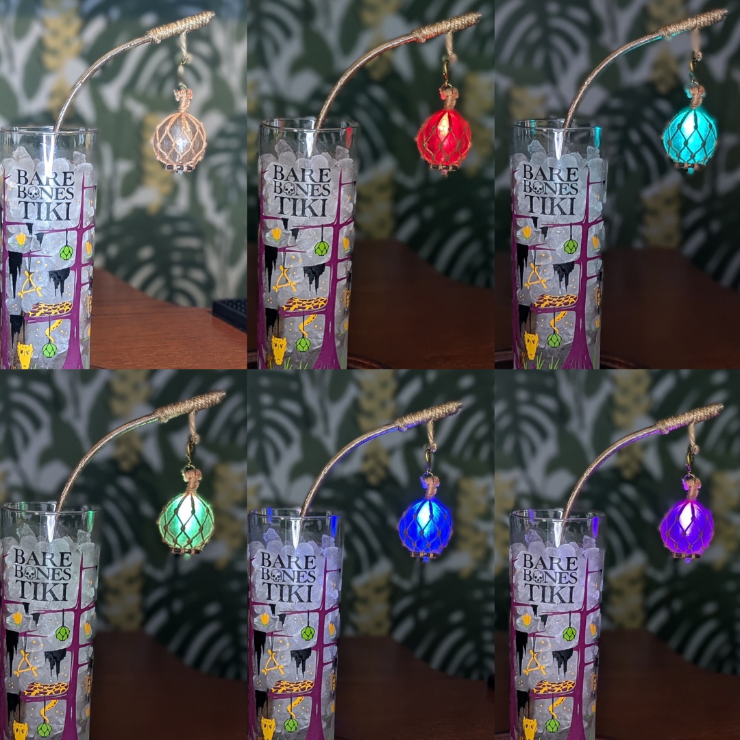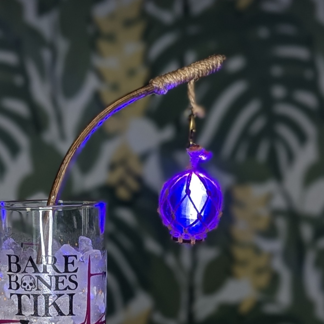 These one-of-a-kind tiki swizzles feature a dangling nautical orb with a light-up feature - and yes, you can change the batteries! The orbs come in different colors: red, orange, yellow, green, blue, purple, and pearl (white or color-changing) and occasional artist proof drops (listed separately).
